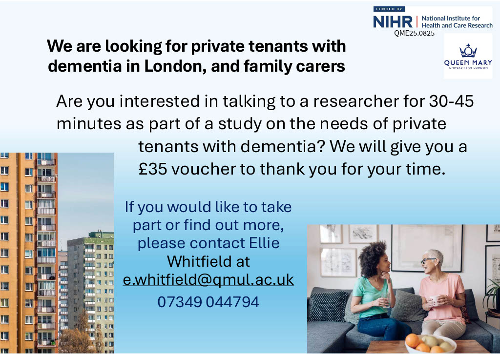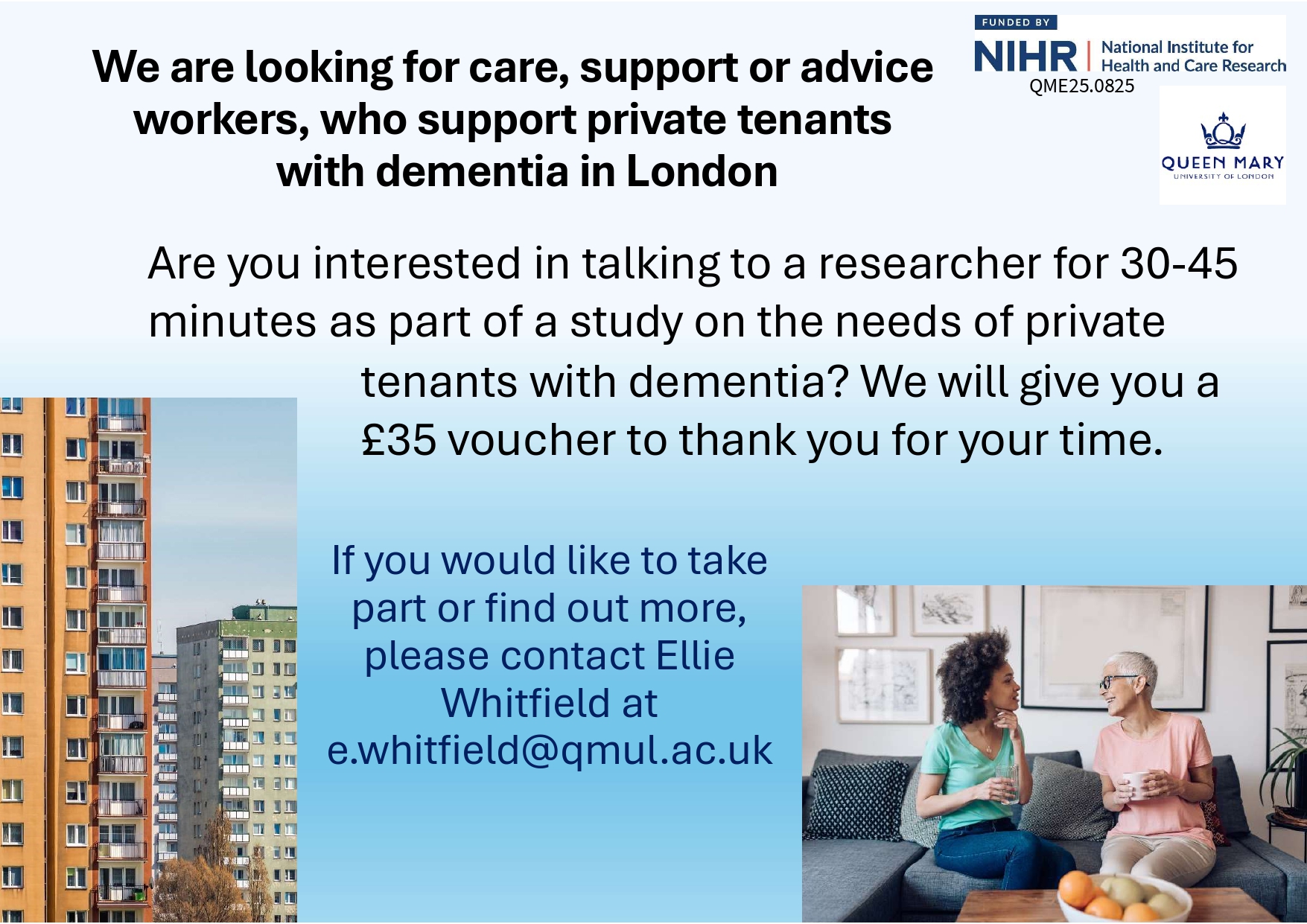 Queen Mary University of London is conducting a study exploring the experiences, including the needs and challenges, of people with dementia who live in privately rented homes in London.